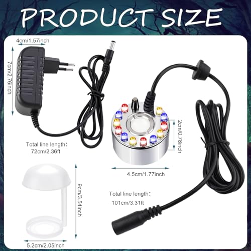 Spritzschutz:Der Mist Maker Fogger produziert eine kleine Menge Wasser, wenn er Nebel erzeugt, daher ist er mit einer wasserdichten Abdeckung ausgestattet, um Wasserspritzer zu reduzieren und unnötigen Ärger zu vermeiden. • Weit verbreitet:Maschine kann dichten Nebel für Ihren Innenbrunnen oder Wasserspiel in Sekunden erzeugen, es ist 100% Wassernebel, geruchlos und farblos. Zerstäuber kann eine große Menge Nebel zu Ihrem Kessel oder Rockery hinzufügen, es wird eine magische und bessere Atmosphäre schaffen. • Einfach und sicher zu bedienen:Platzieren Sie Ihren Nebelmacher Nebelmacher in Wasser horizontal und schließen Sie die Energie an, dann Nebel herauskommen, erhalten Sie den besten Effekt, wenn die Wasserlinie 2-3cm (1inch) höher als die Oberseite der Nebelmaschine ist. Bitte verwenden Sie auch sauberes Wasser, und die Befeuchter Nebel Nebel verbrauchen Wasser mit einer Geschwindigkeit von 400ml/H. und der Zerstäuber ist mit Isolierbeschichtung bedeckt. Achten Sie darauf, den Luftbefeuchter nich • Kleine Größe:Der Teil des Drahtes in der Nähe des Nebelmachers ist dicker, und egal, wie viel es gebogen ist, Sie können nicht dafür sorgen, dass es keinen Platz einnimmt. So benötigen Sie einen Raum von mindestens 5cm (2inch) in Länge, Breite und Höhe, um die Nebelmaschine zu platzieren. • Attraktive 12 LED Leuchten:Ihr Nebelmacher ändert die Farbe zufällig, wenn er verwendet wird, wodurch ein traumhafter Lichteffekt entsteht, der für Menschen geeignet ist, die dynamische Lichteffekte genießen. Es sollte beachtet werden, dass dieser Nebelhersteller keine freie Anpassung der Lichtfarbe unterstützt, und Sie können die Änderungen in LED nicht steuern. Es ist völlig zufällig.