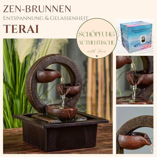 Zen’Light Zimmerbrunnen Zen Terai, originelle Innendekoration, natürlicher Wasserfluss, mehrfarbige LED-Beleuchtung, leise, L 17 x B 21 x H 25 cm, Braun